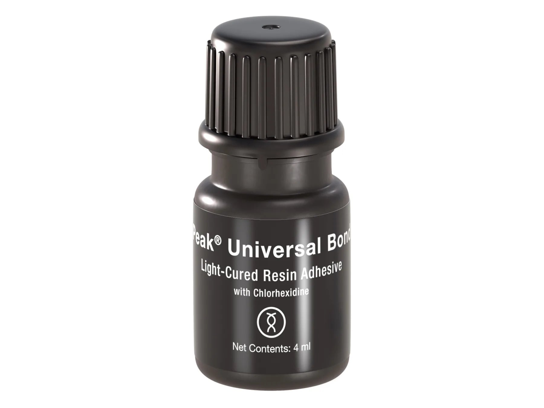 La fórmula versátil del adhesivo Peak Universal Bond es ideal para la unión indirecta y directa, incluidos los procedimientos de postes y muñones. Con un 7,5 % de relleno, su viscosidad se ha optimizado para lograr un espesor de película mínimo (2 μm) y una resistencia superior. Peak Universal Bond también contiene un 0,2 % de clorhexidina que ayuda a garantizar la resistencia de la unión a largo plazo al evitar la degradación del colágeno en la dentina o la capa híbrida debido a las metaloproteinasas de la matriz (MMP). 1